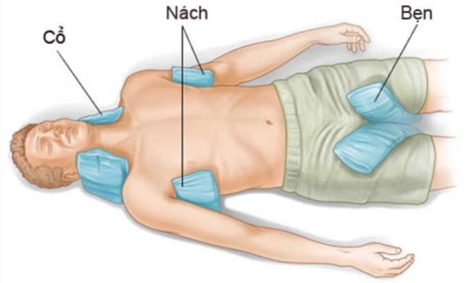 Hạ nhiệt cơ thể: Cởi bớt quần áo, dùng khăn ẩm đắp lên các vị trí có nhiều mạch máu như cổ, nách, bẹn và dùng quạt để tăng tốc độ thải nhiệt.